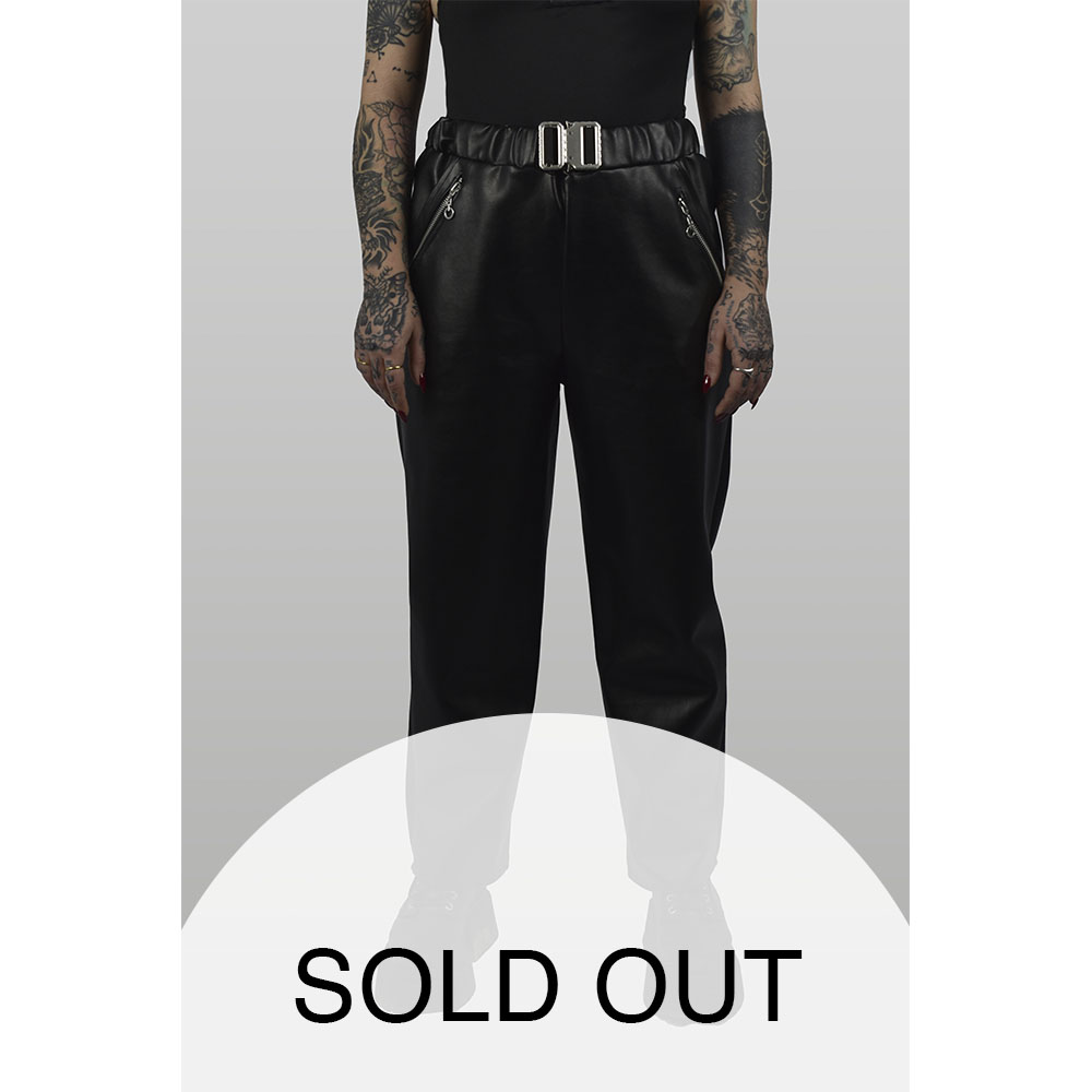 Handmade leather pants. Its waist is elastic. It has a metal buckle as a belt and pockets on the sides, along with a zipper. It has a straight shape.